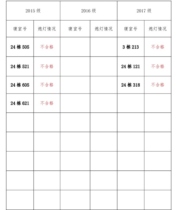 为改正各种不良现象和陋习,增强宿舍学习氛围,营造温馨家园氛围,必赢626net入口首页团委学生会生活权益服务部对三个年级所有寝室进行熄灯检查。本次熄灯情况通报不合格寝室7间,具体情况如下: