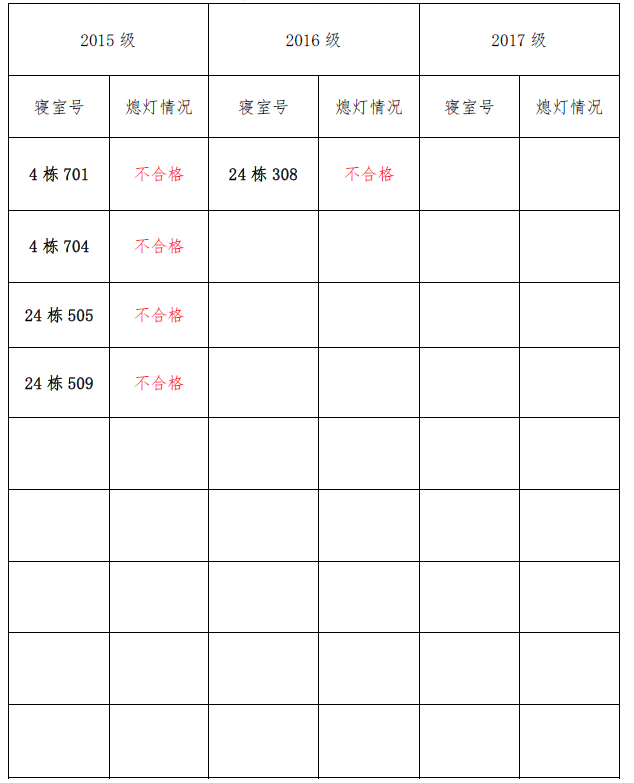 为改正各种不良现象和陋习,增强宿舍学习氛围,营造温馨家园氛围,必赢626net入口首页团委学生会生活权益服务部对三个年级所有寝室进行熄灯检查。本次熄灯情况通报不合格寝室5间,具体情况如下: