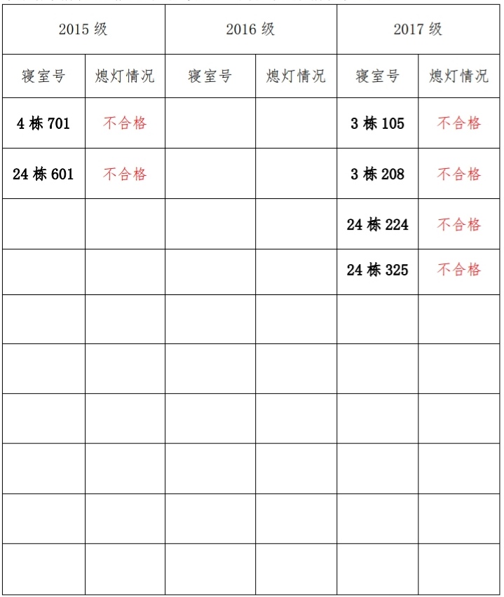 为改正各种不良现象和陋习,增强宿舍学习氛围,营造温馨家园 氛围,必赢626net入口首页学生会生活部对三个年级所有寝室进行熄灯检查。本次熄灯情况通报不合格寝室 6 间,具体情况如下: