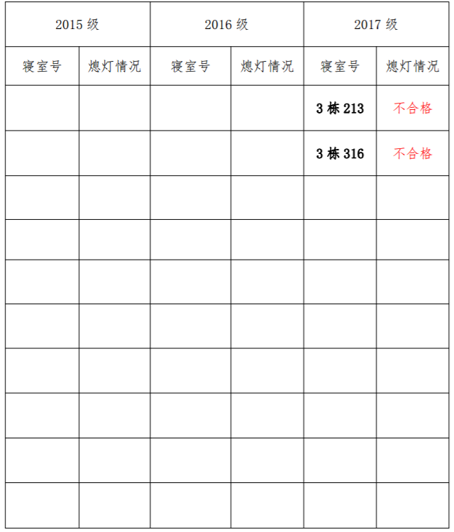 为改正各种不良现象和陋习,增强宿舍学习氛围,营造温馨家园氛围,必赢626net入口首页团委学生会生活权益服务部对三个年级所有寝室进行熄灯检查。本次熄灯情况通报不合格寝室2间,具体情况如下: