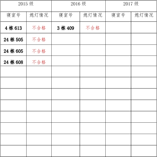 为改正各种不良现象和陋习,增强宿舍学习氛围,营造温馨家园氛围,必赢626net入口首页团委学生会生活权益服务部对三个年级所有寝室进行熄灯检查。本次熄灯情况通报不合格寝室5间,具体情况如下:
