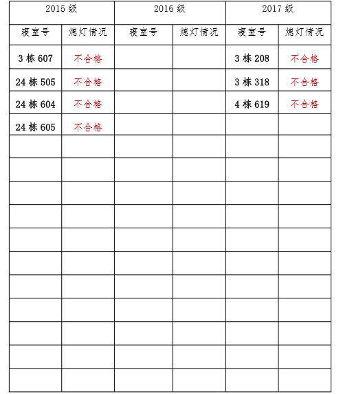 为改正各种不良现象和陋习,增强宿舍学习氛围,营造温馨家园氛围,必赢626net入口首页团委学生会生活权益服务部对三个年级所有寝室进行熄灯检查。本次熄灯情况通报不合格寝室 7 间,具体情况如下: