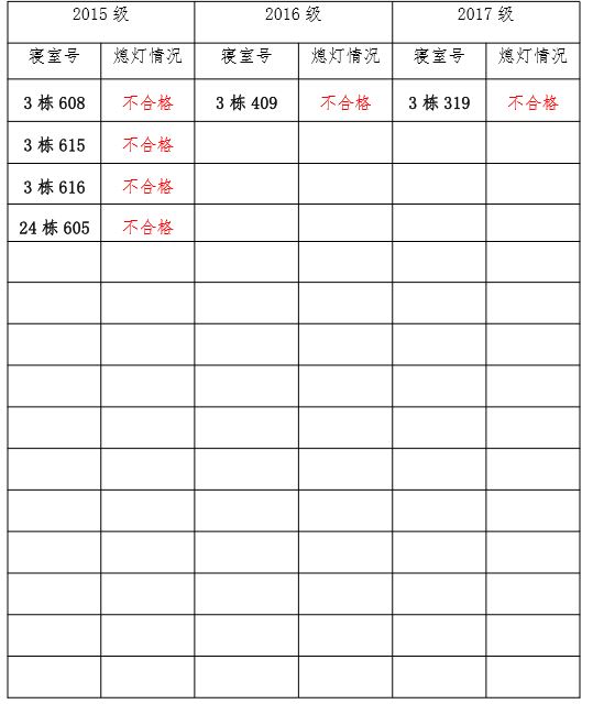 为改正各种不良现象和陋习,增强宿舍学习氛围,营造温馨家园氛围,必赢626net入口首页团委学生会生活权益服务部对三个年级所有寝室进行熄灯检查。本次熄灯情况通报不合格寝室 6 间,具体情况如下: