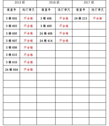 为改正各种不良现象和陋习,增强宿舍学习氛围,营造温馨家园 氛围,必赢626net入口首页团委学生会生活权益服务部对三个年级所有寝室进行熄灯检查。本次熄灯情况通报不合格寝室 13 间,具体情况如下: