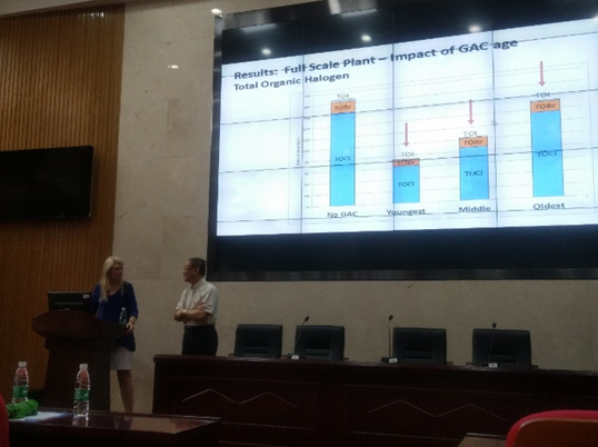 在这次讲座中,Richardson教授科学地概述了饮用水DBPs的形成过程,以及如何借助气相色谱(GC)、液相色谱(LC)与高分辨率质谱全面识别未知的DBPs。此外,Richardson教授还介绍了她最近进行的研究,包括水力压裂对DBPs形成的影响,以及尝试使用颗粒活性炭(GAC)去除DBPs前体使饮用水更安全。Richardson教授的讲座内容丰富有趣,脉络清晰,深入浅出,启发性强。讲座过程中互动频繁,现场氛围热烈,针对同学们提出的问题,Richardson教授耐心解答,在场师生受益匪浅。讲座在大家热烈的掌声中落下帷幕。