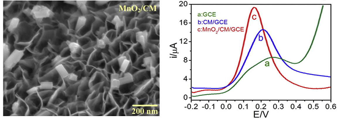 来源:Junhua Li, Jianbo Jiang, Mengqin Liu, Zhifeng Xu, Peihong Deng, Dong Qian*, Chaoying Tong, Haobin Xie, Chunming Yang*. Facile synthesis of MnO2-embedded flower-like hierarchical porous carbon microspheres as an enhanced electrocatalyst for sensitive detection of caffeic acid[J]. Analytica Chimica Acta, 2017, 985: 155-165.