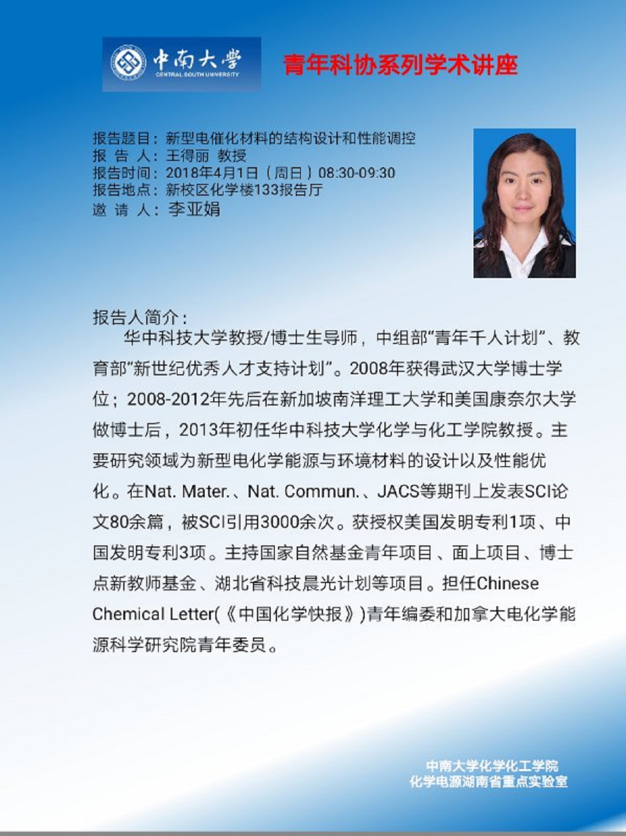 2018年4月1日 王得丽教授 《新型电催化材料的结构设计和性能调控》报告