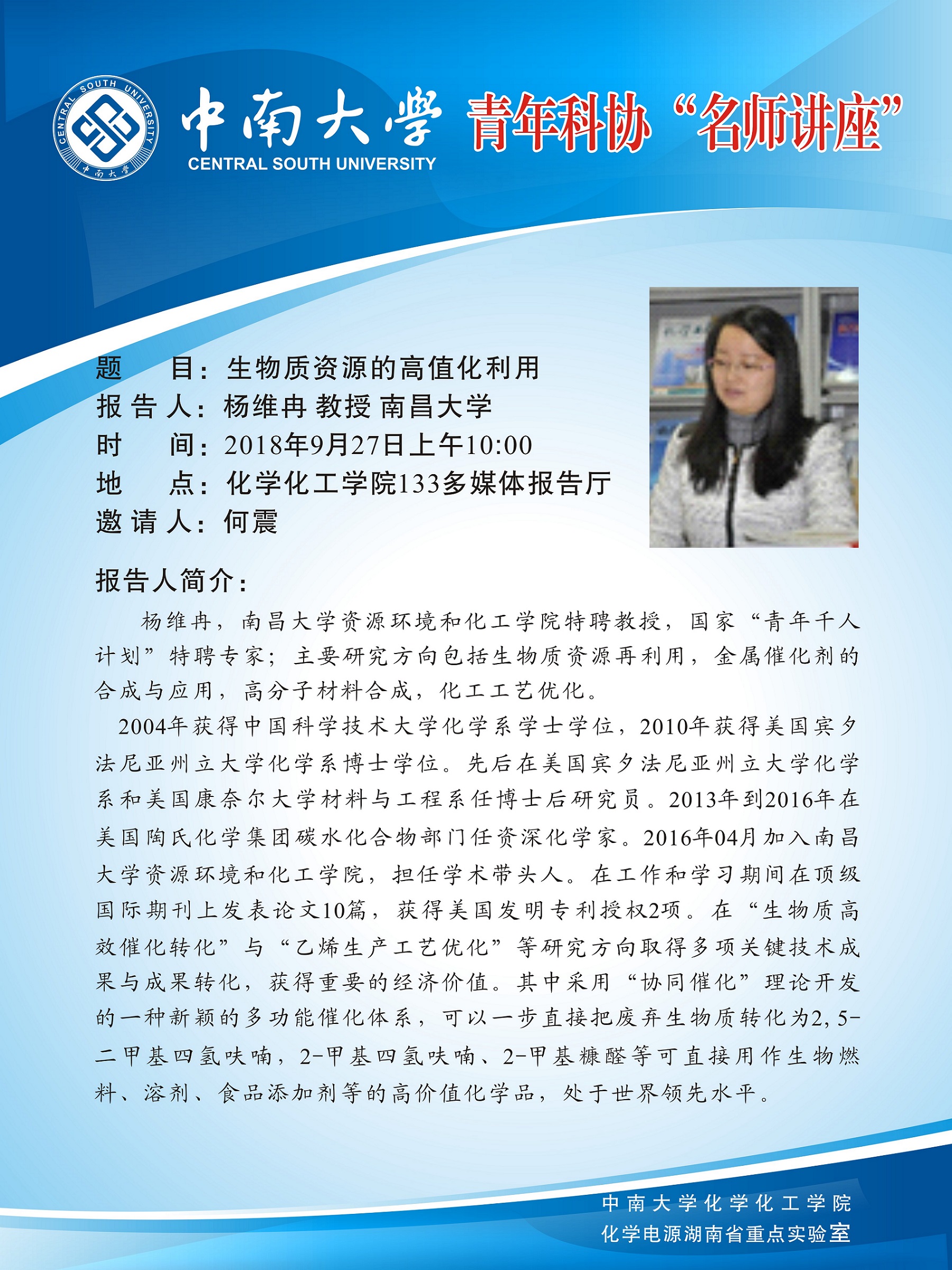 2018年9月27日 杨维冉教授 《生物质资源的高值化利用》报告