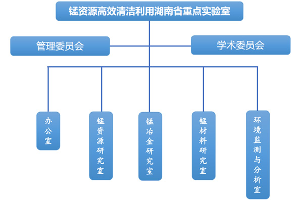 重点实验室设办公室、锰资源研究室、锰冶金研究室、锰材料研究室和环境监测与分析室等部门。办公室主要负责日常管理与对外联络工作;锰资源研究室主要从事难处理锰矿高效选矿富集技术研究;锰冶金研究室主要从事电解锰节能降耗技术、电解锰渣无害化处理与资源化利用技术、电解锰钝化剂等方面的研究;锰材料研究室主要从事锰系催化剂、锰系能源材料及新型锰化工产品的研发;环境监测与分析室主要从事电解锰渣环境影响评价、分析测试、仪器共享等技术服务工作。